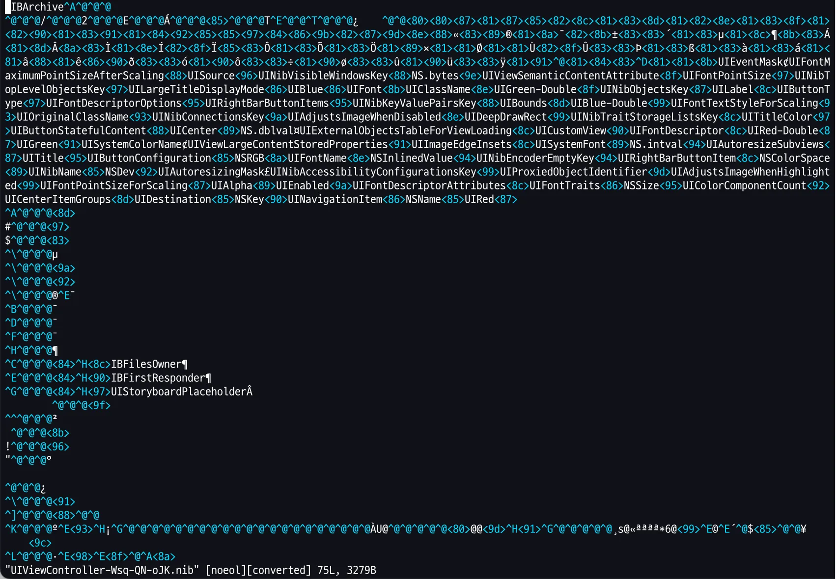 nib 파일은 바이너리 형식이기 때문에 열어도 이해할 수 없는 형식이었습니다. 물론 바이너리로 변환하면 0과 1로 나타날 것입니다.