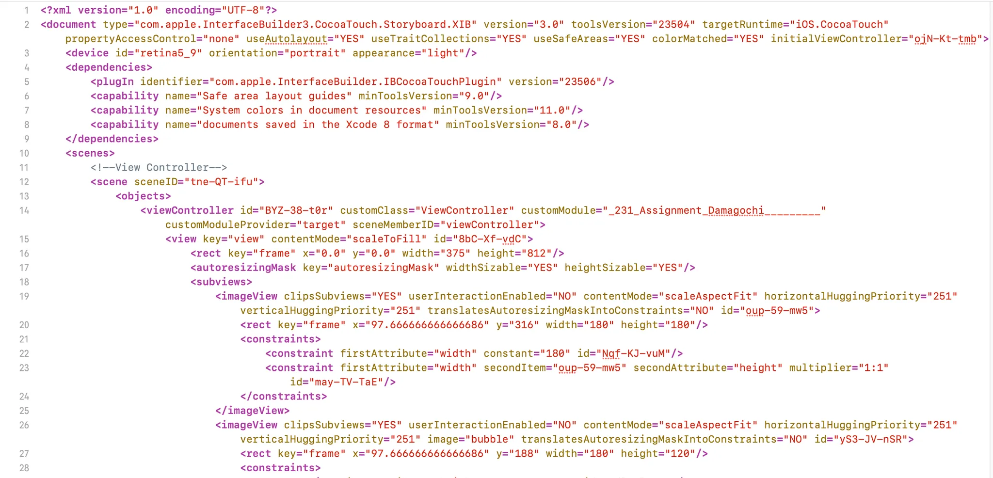 스토리보드 → 우클릭 → [Open As] → [Source Code]를 확인해보면 다음과 같이 XML 형식으로 구성되어 있음을 알 수 있습니다.
