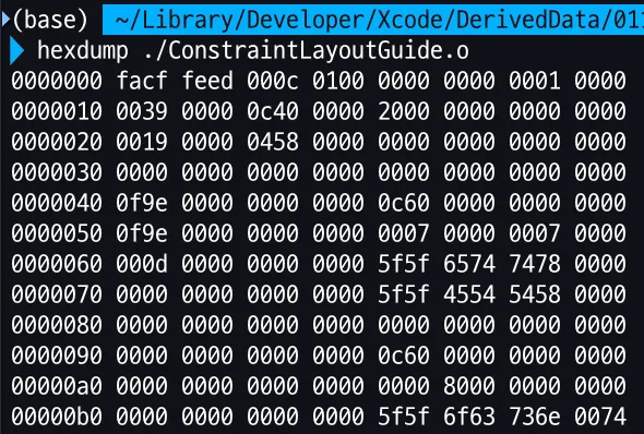 어셈블러는 어셈블리 코드를 재배치가능(relocatable)한 기계어로 변환해주는데, 이때 Mach-O 파일을 생성합니다. (C언어의 .o 파일을 생성하는 것과 비슷한 원리입니다.) 재배치 가능한 파일이란 실행 가능한 파일을 생성하기 위해 다른 오브젝트 파일들과 링킹할 수 있는 코드와 데이터를 갖는 파일입니다. 바이너리 코드와 데이터를 가지고 있으며, 메모리로 직접 할당되어 실행됩니다. [Library] → [Developer] → [Xcode] → [DerivedData]에서 앱을 하나 골라 .o file을 찾아 열어보았습니다.