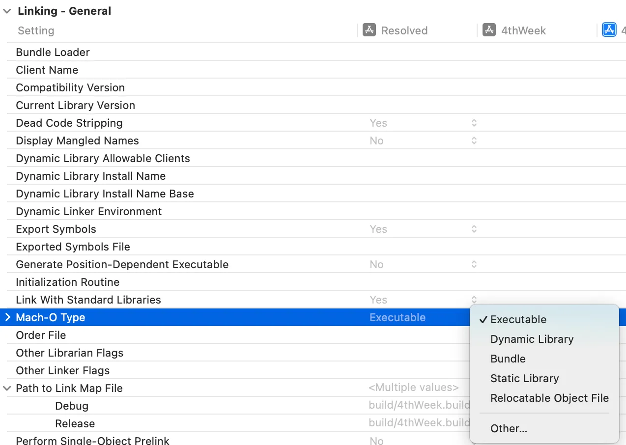 링커는 위에서 확인한 Mach-O 파일을 병합하여 iOS 또는 macOS가 실행될 수 있는 하나의 실행 가능한 Mach-O 파일로 만듭니다. 어셈블러와 링커는 둘 다 오브젝트 파일을 생성한다는 공통점이 있지만, 어셈블러는 재배치가능한 파일로, 다른 오브젝트 파일을 참조하는 부분이 없고, 링커는 symbol table을 활용하여 오브젝트 파일들에 대한 참조를 확인하고, 연결까지 해준다는 차이점이 있습니다. 만약 Executable 설정을 다른 설정으로 변경하게 되면 실행이 되지 않습니다.