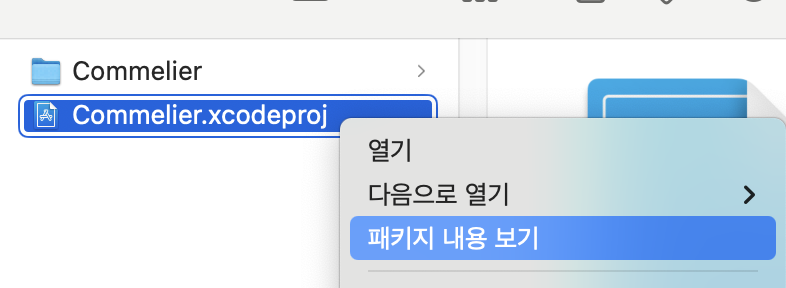 pbxproj는 xcodeproj에서 '패키지 내용 보기'를 선택하면, pbxproj를 확인할 수 있습니다.