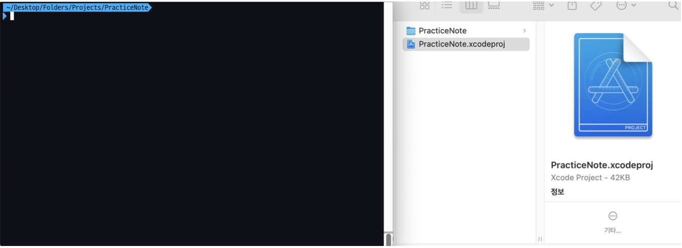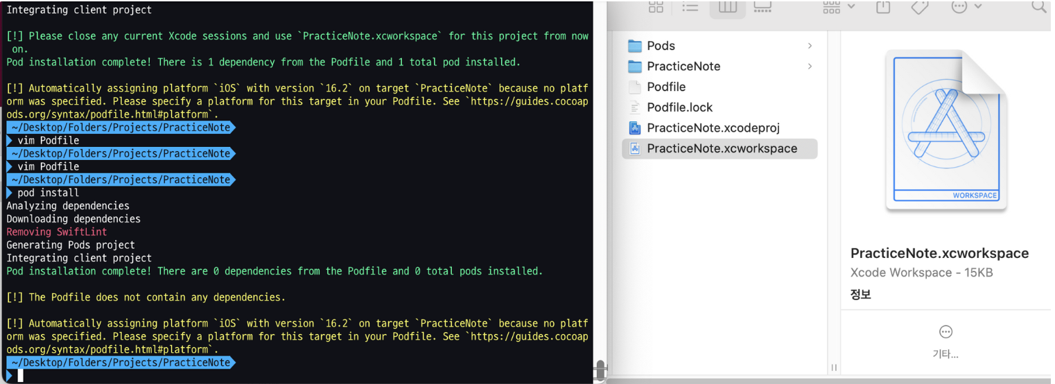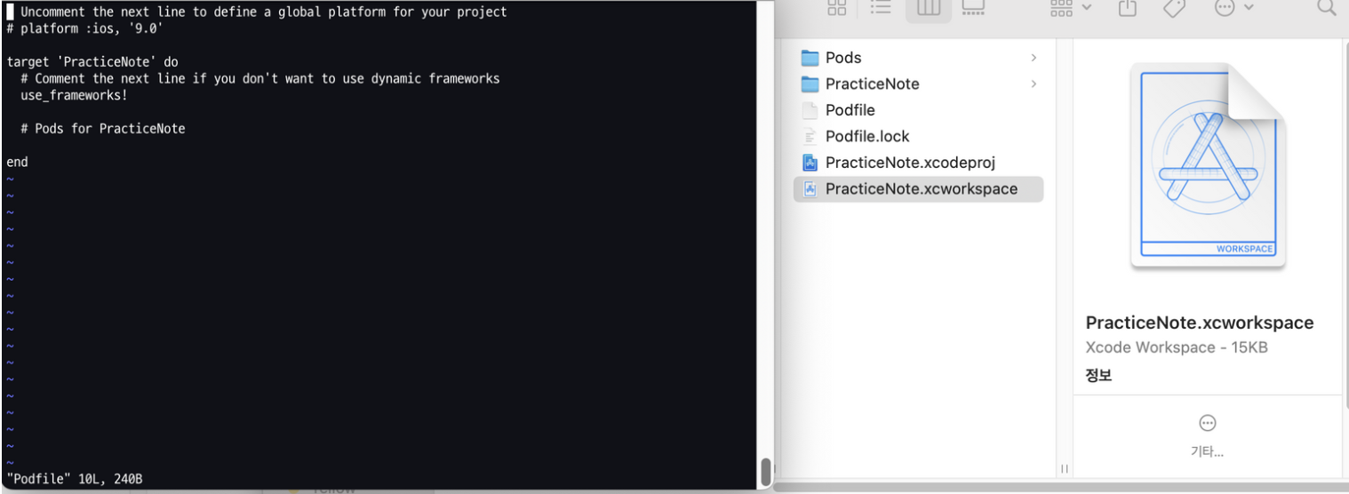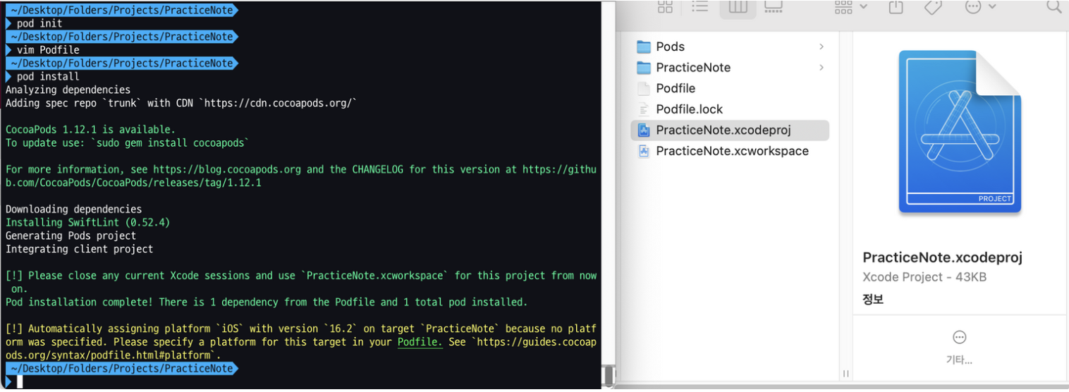 위처럼 진행하면 여러 파일이 생성되는데, 이 중에서 xcworkspace 파일을 눈여겨보아야 합니다.
