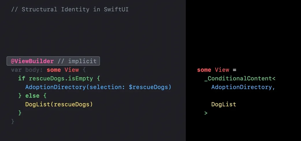 개발자가 ID를 직접 주지 않아도, SwiftUI가 코드의 구조(타입과 위치)를 보고 암시적으로 정체성을 부여하는 방식입니다. 마치 "왼쪽에 앉은 강아지"처럼 위치로 구별하는 것과 같습니다.