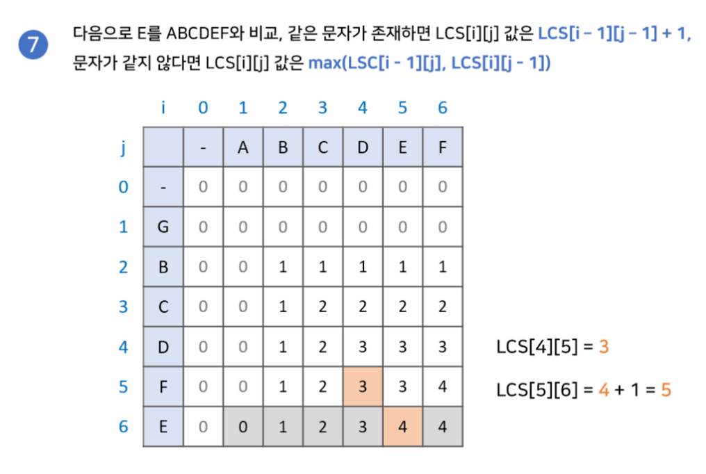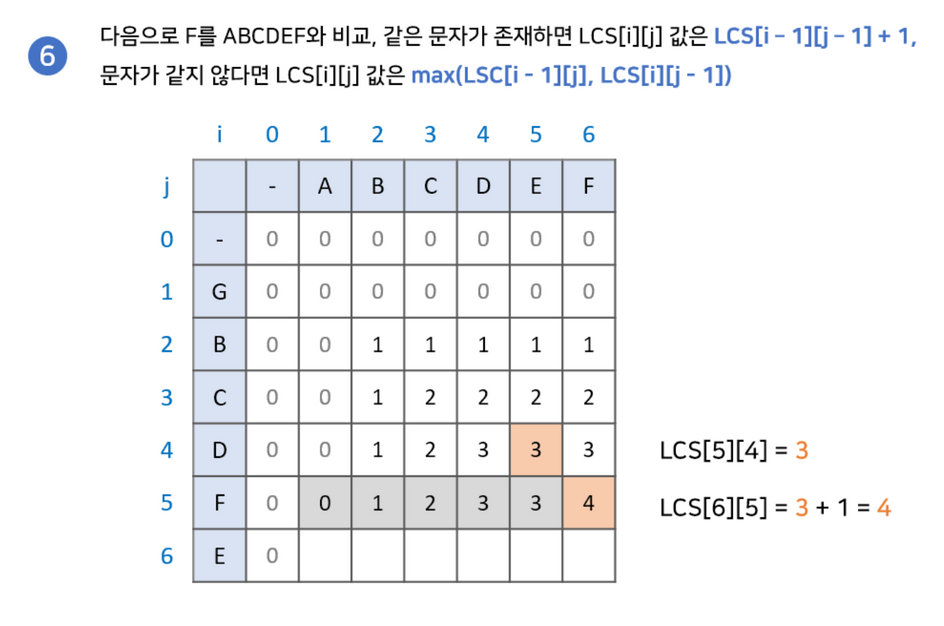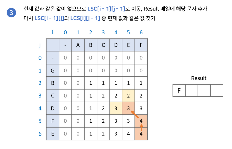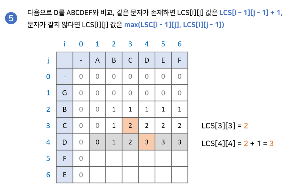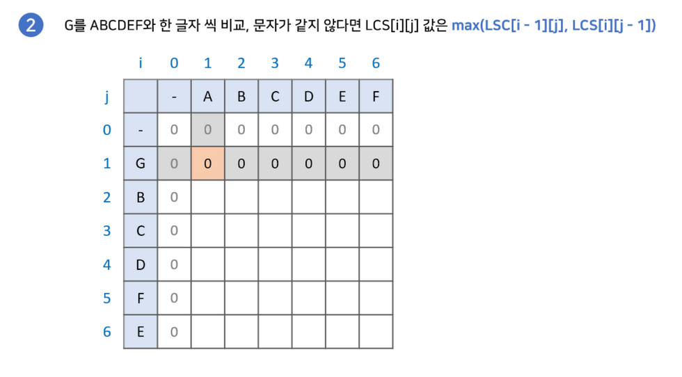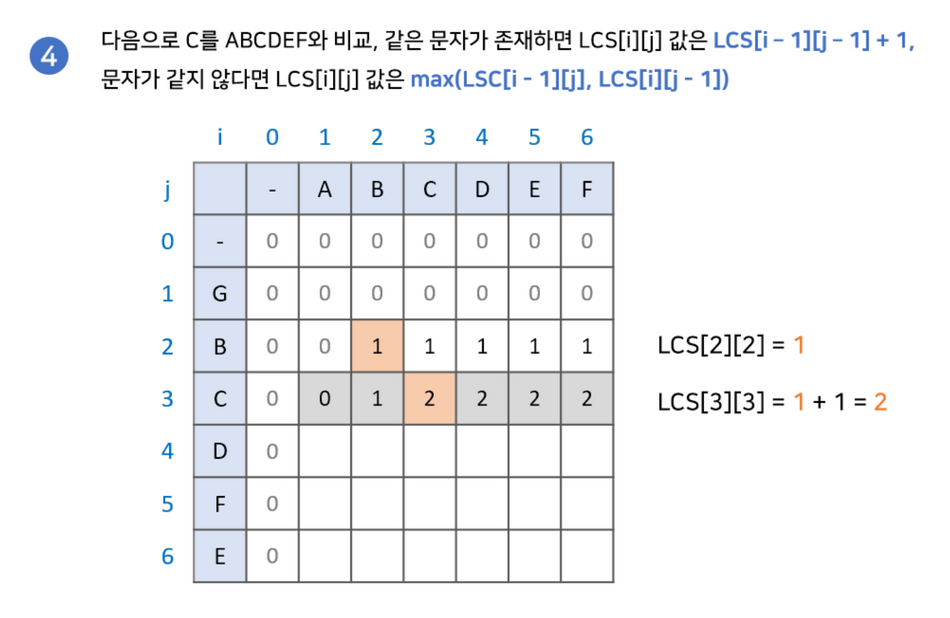 - 만약 다르다면 LCS[i-1][j]와 LCS[i][j-1] 중에 큰 값을 표시합니다.