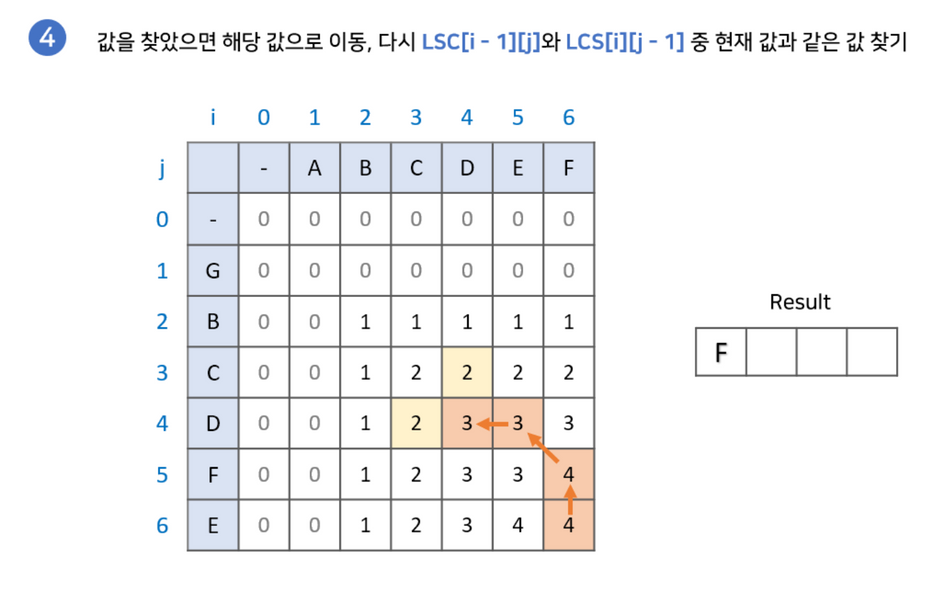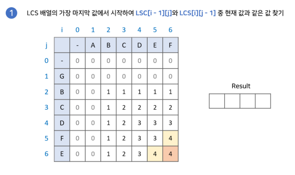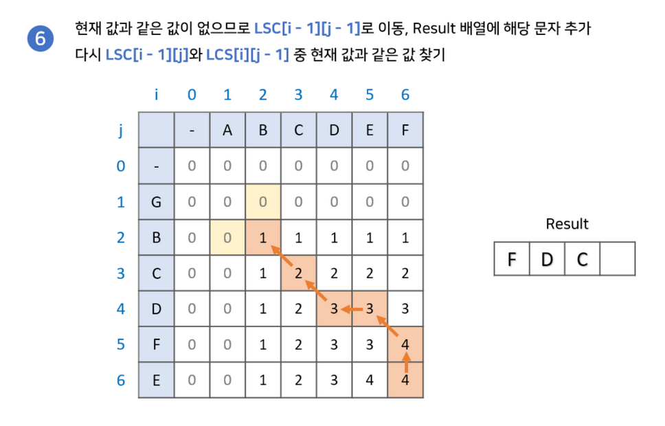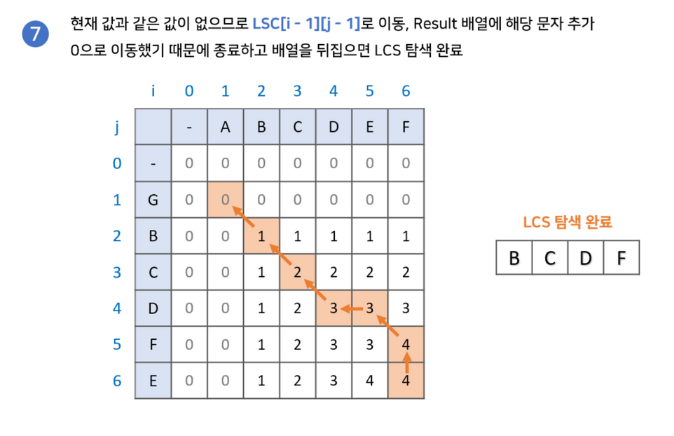 위 식을 반복하여 나온 결과값의 역순이 우리가 구하고자 하는 LCS값입니다.
