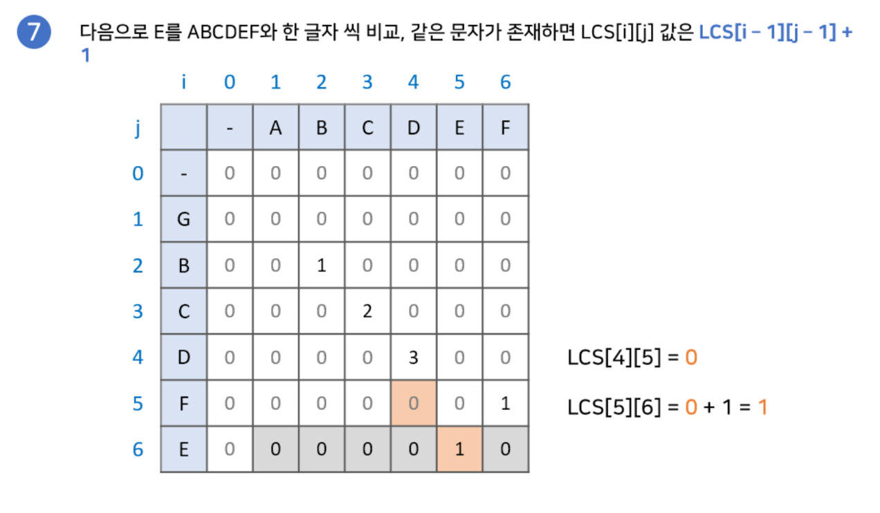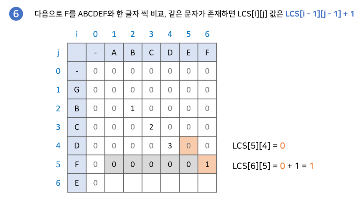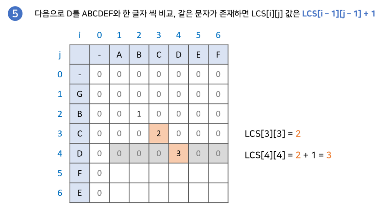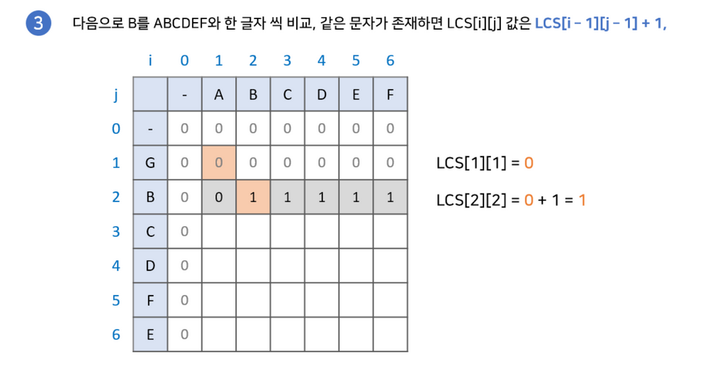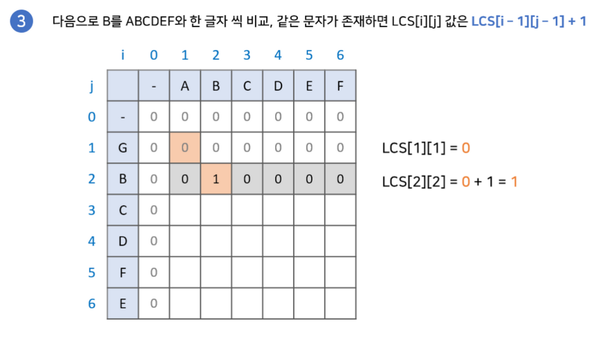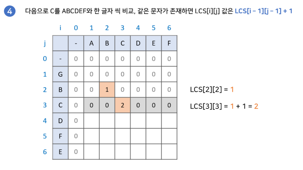 - 만약 두 문자가 같다면 LCS[i][j]에 = LCS[i-1][j-1] + 1을 해줍니다.