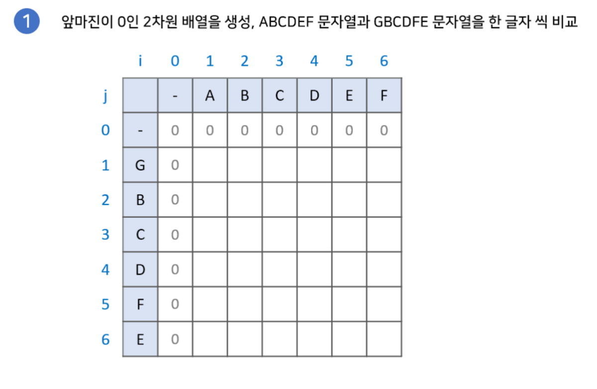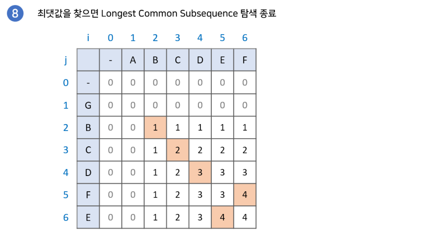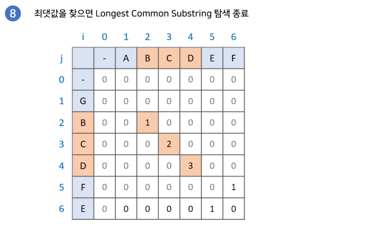 위 식을 반복하게 된다면 최장 공통 문자열의 문자 개수를 얻을 수 있습니다.
