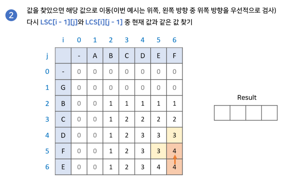 - LCS[i-1][j]와 LCS[i][j-1] 중 현재 값과 같은 값을 찾습니다.2-2. 만약 없다면 해당 문자를 넣고 LCS[i-1][j-1]로 이동합니다.