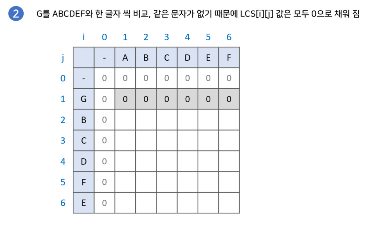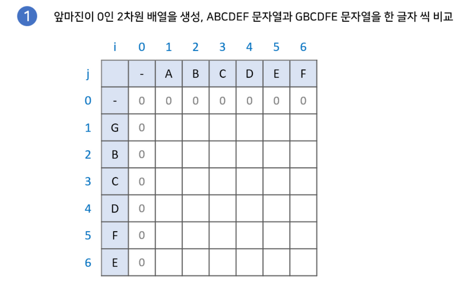 - 만약 다르다면 LCS[i][j]에 0을 대입합니다.