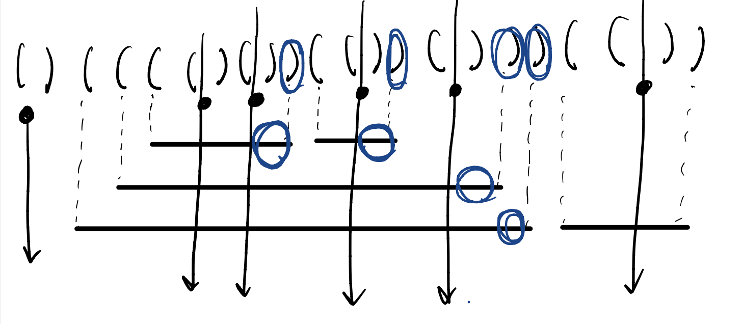 스택을 두어 "("가 나올 때는 스택의 값을 증가시킵니다.