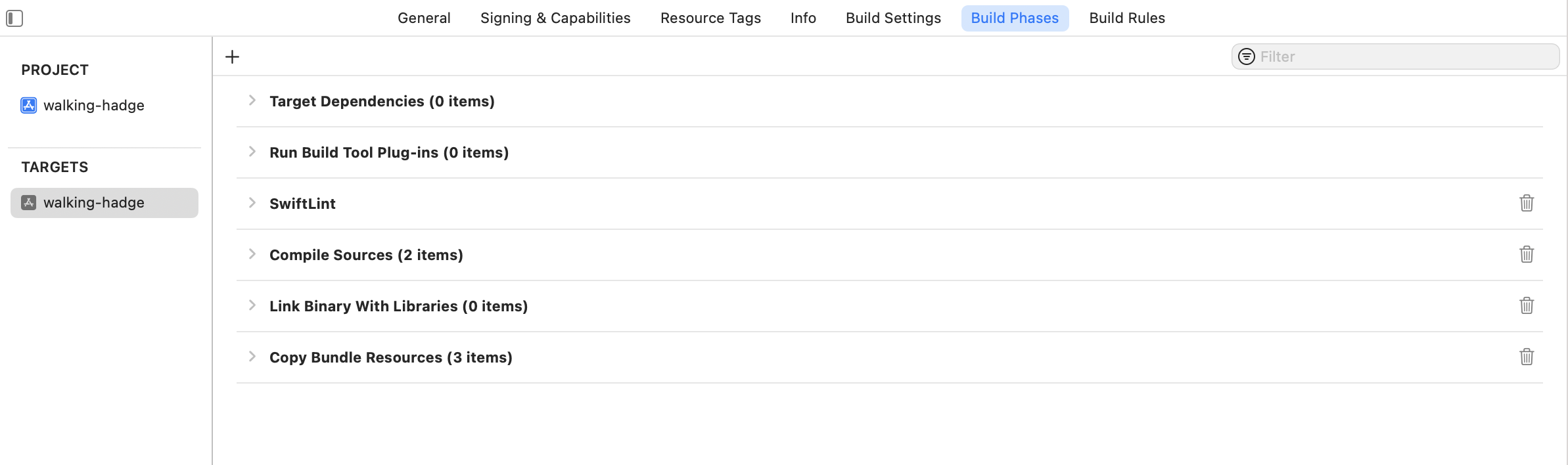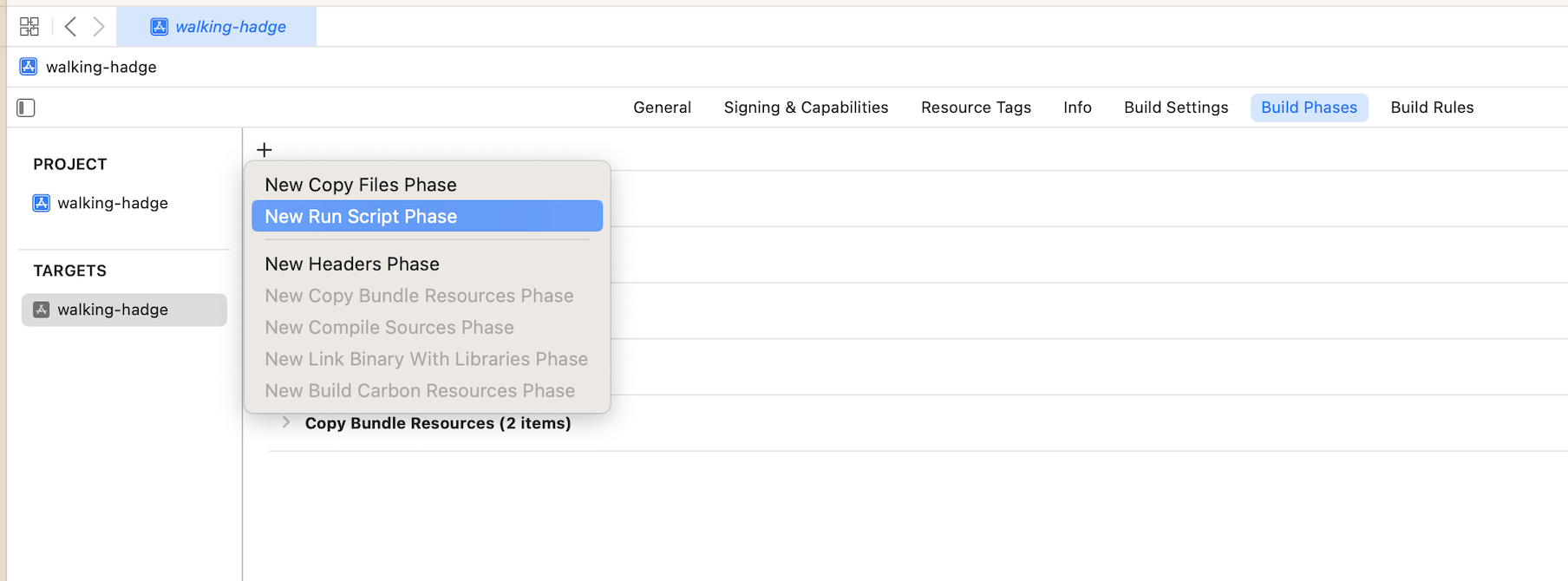 설치를 진행하였으면, Xcode를 실행하여 [Targets] -> [Build Phases] -> '+' 버튼 -> [New Run Script Phase]을 클릭하고,