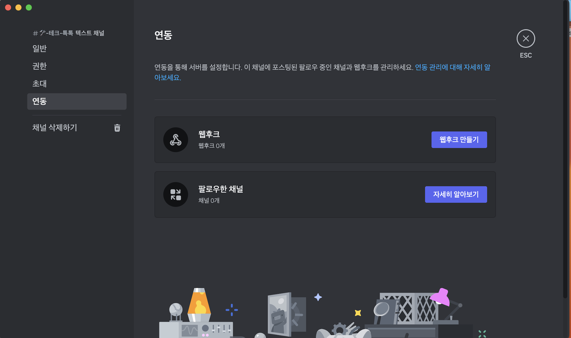 만약 해당 서버의 관리자가 아니라면, 관리자로부터 웹훅 권한을 얻은 뒤에 진행하실 수 있으니 참고하시길 바랍니다.
