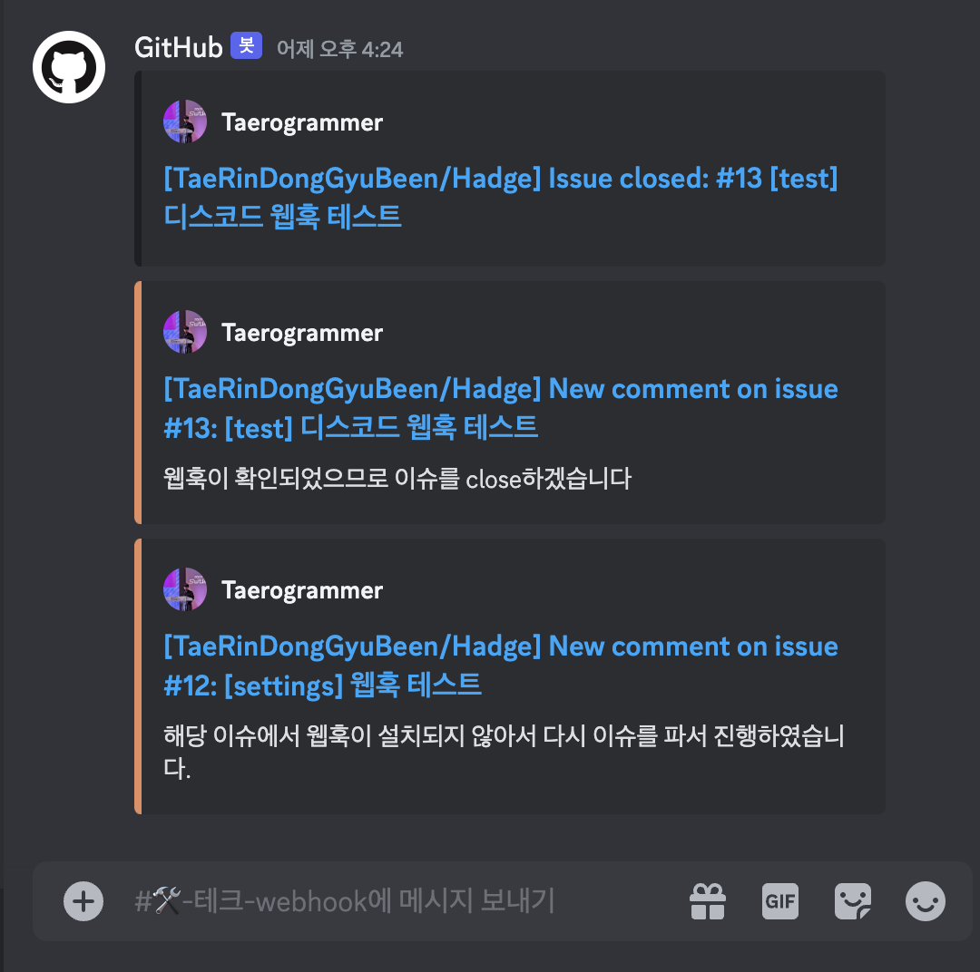 웹후크를 설정하면 이슈를 생성하거나, PR을 요청했을 때 디스코드에서 알림이 가기 때문에 협업을 진행할 때에 매우 유용합니다.
