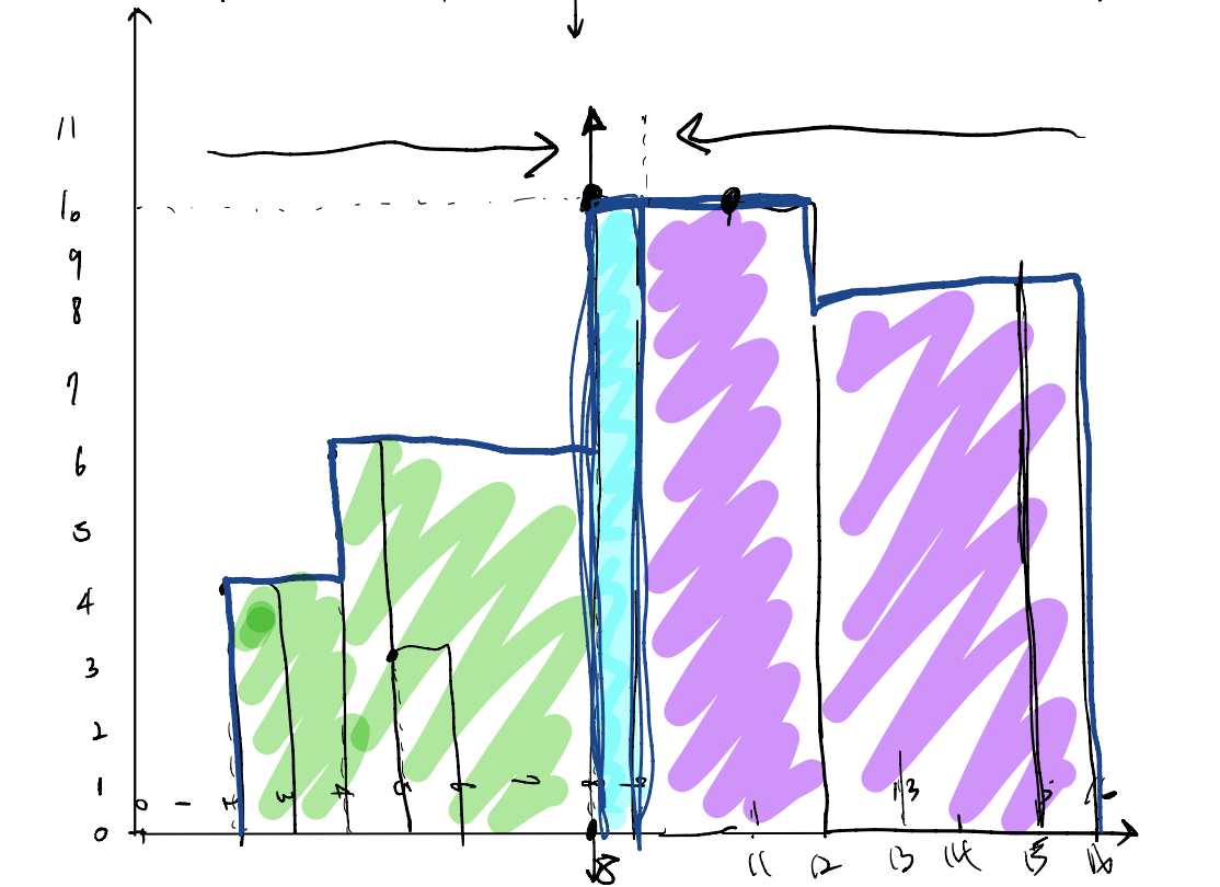 여기서 제가 고민했던 부분은 '최대 높이가 여러 개 있으면 어떻게 해야하는지'였는데, 최대 높이가 나타난 가장 처음 인덱스를 기준으로 왼쪽 부분과 오른쪽 부분을 나누고 계산하면 오른쪽 부분에서 최대 높이를 고려한 결과가 나타납니다.